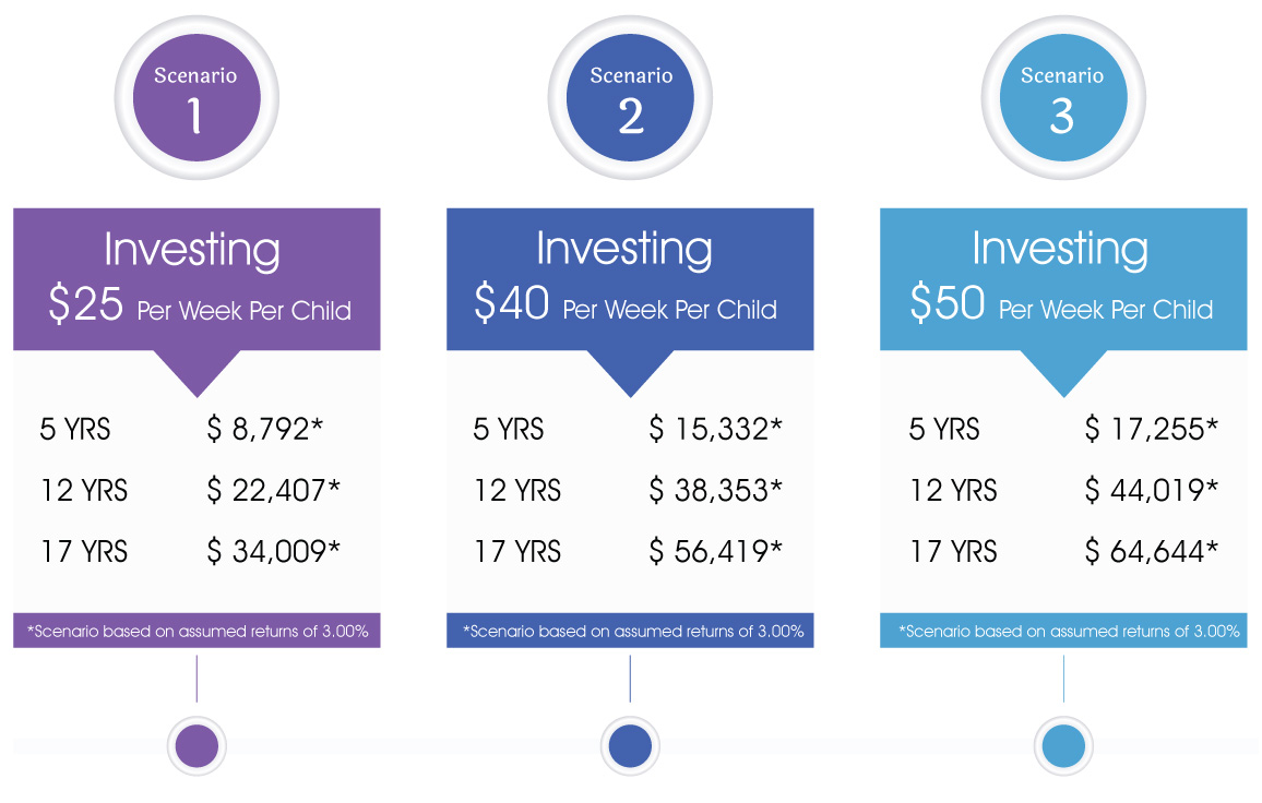 See how investing per week per child in an RESP adds up quickly when supplemented by the federal and provincial incentives.